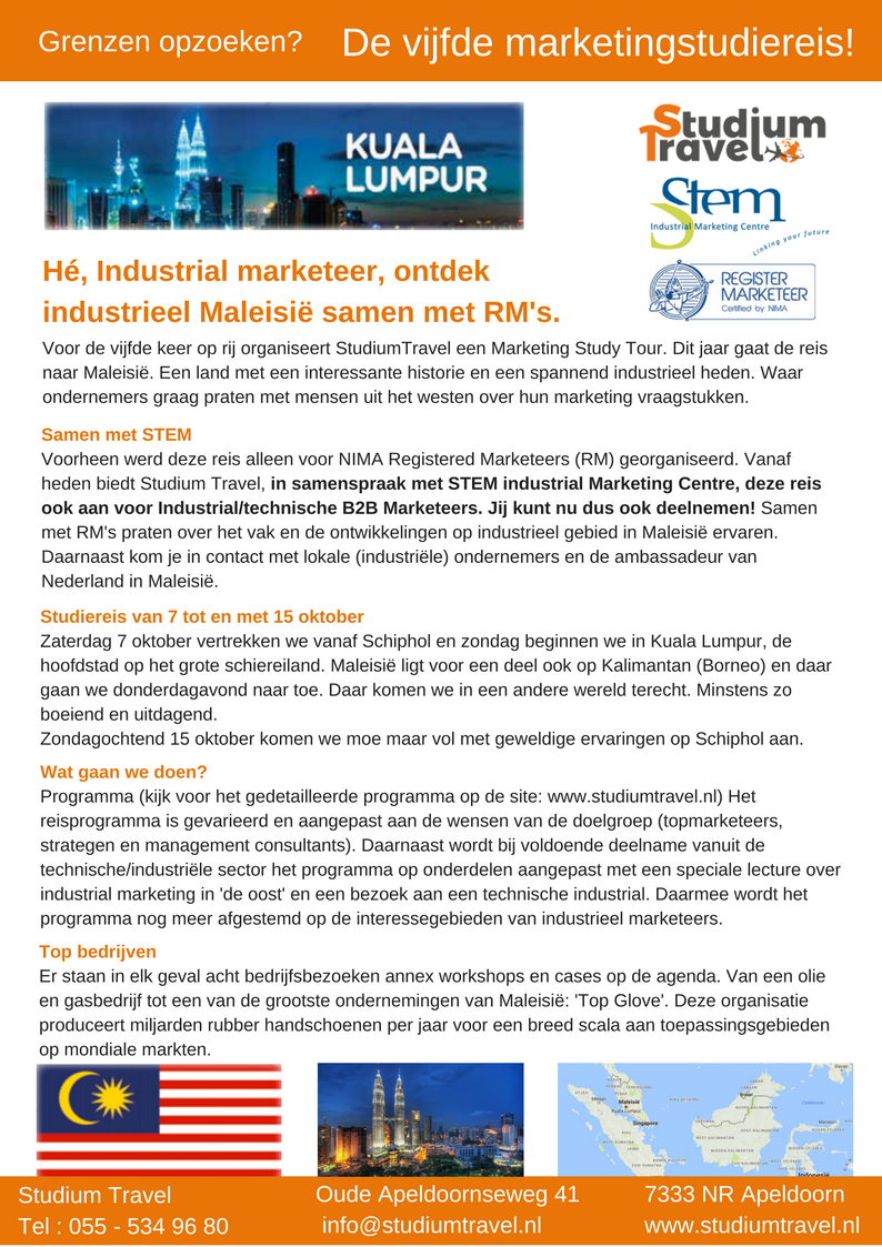 Voorheen werd deze reis alleen voor NIMA Registered Marketeers (RM) georganiseerd. Vanaf heden biedt Studium Travel, in samenspraak met STEM industrial Marketing Centre, deze reis ook aan voor Industrial/technische B2B Marketeers. Jij kunt nu dus ook deelnemen! Samen met RM's praten over het vak en de ontwikkelingen op industrieel gebied in Maleisië ervaren. Daarnaast kom je in contact met lokale (industriële) ondernemers en de ambassadeur van Nederland in Maleisië.